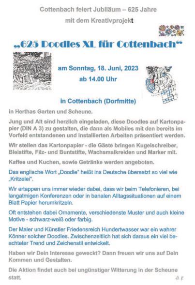 Hermann Kugler wohnt in Altenplos und bezeichnet sich selbst als Gestaltungskünstler. Am Sonntag Vormittag wartete er in Herta’s Kulturscheune auf die ersten Besucher. Geduldig erklärt er jedem Ankömmling, was hinter dem Begriff „doodle“ steckt. Das Wort kommt aus dem Englischen und bedeutet so viel wie „kritzeln“. Daraus können nicht ganz perfekte Zeichnungen oder Muster entstehen, die wir zum Beispiel beim Telefonieren nebenbei anfertigen. Doodles sind ein herrlicher Kontrast zu unserer sonst perfekt gestylten Umwelt. Inzwischen kritzeln die kleinsten im Kindergarten schon ihre Gedanken auf ein Blatt Papier. Hermann Kugler hat den Trend aufgenommen und zusammen mit Lehrkräften in Schulen und Kitas und auch im privaten Wohnumfeld genau 625 Motive zusammengetragen. Damit möchte er eine Verbindung zur 625-Jahr-Feier der Cottenbacher herstellen. Die DIN-A3-Blätter hängen an Schnüren aufgehängt in Herta’s Scheune. Am 18. Juni 2023 war dann der Doodle-Tag in Cottenbach. Auf einem großen Tisch lagen noch weitere Blätter aus, auf denen sich die Besucher verewigen konnten.